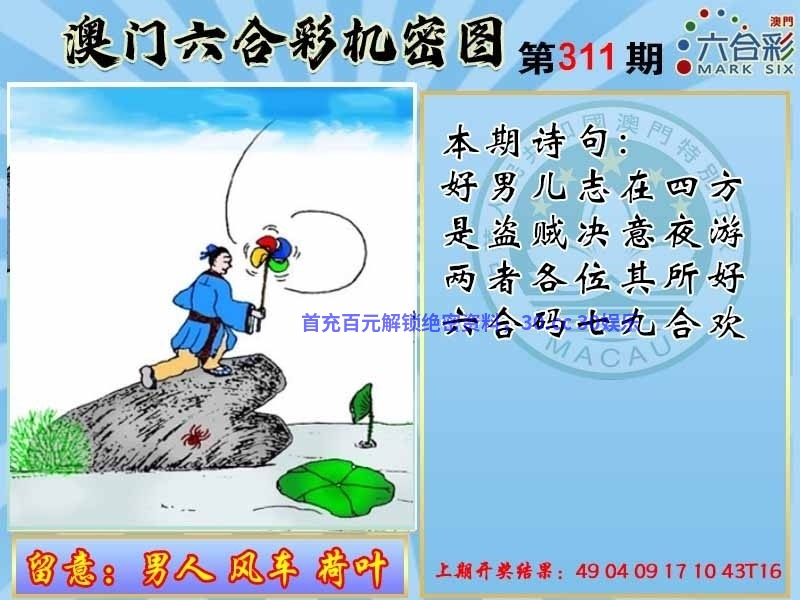 | 311期【解机密图】:开(發00) 好男儿志在四方,是盗贼决意夜游,两者各位其所好,六合码七九合欢。 【解】:好男儿志在四方可解男肖的生肖,是盗贼决意夜游可解夜肖的生肖。 【综合取特】蛇狗龙鸡马鼠 【主特三肖】蛇狗龙 【提示波色】蓝波 |